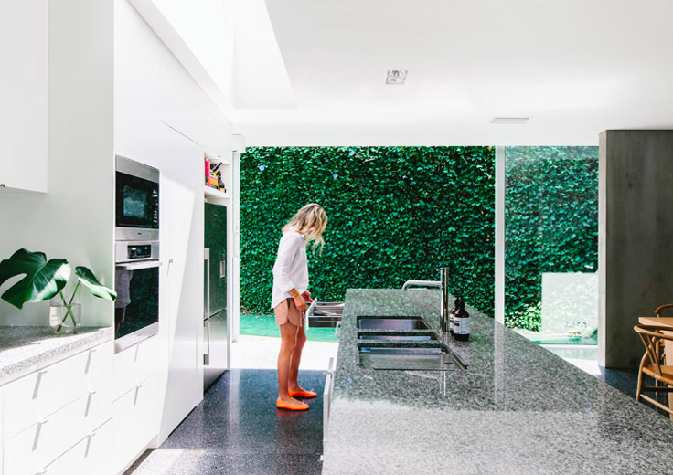 This modern, relaxed family home in Malvern, with open spaces, concrete floors, floor to ceiling windows, is surrounded by an ever green garden and ivy clad walls. The olive green front door sets the tone for entering the home. The liberal use of concrete not only provides a sculptural strength and a seamless backdrop but also ensures a greater thermal mass.